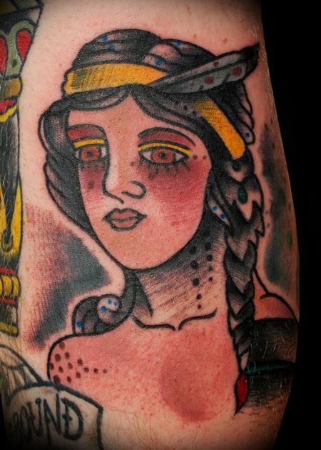 I reworked an old Bert Grimm flapper gal I saw in a book. It's positioned on the inside of the clients right knee. I've been having fun mixing whip shade with stiple and circle patterns.